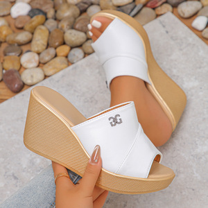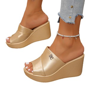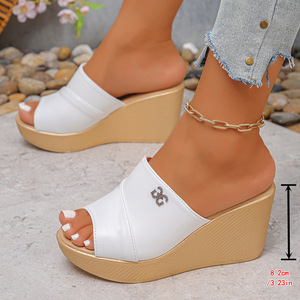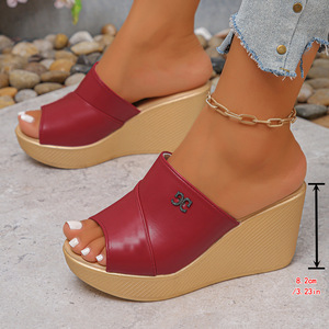 外贸女士时尚露趾鱼嘴坡跟拖鞋2025夏季新款厚底外穿大码一字拖鞋