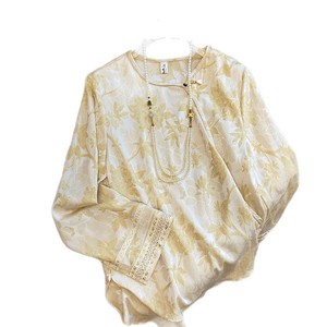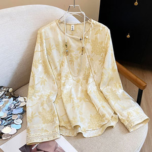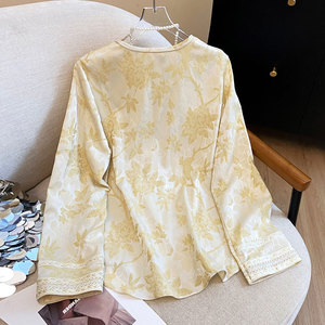 新中式真丝桑蚕丝上衣国风醋酸缎面小衫圆领提花刺绣长袖衬衫女秋