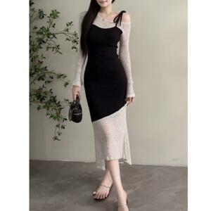小香风时尚假两件撞色拼接不规则鱼尾毛针织连衣裙高级感包臀裙子