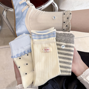 芭蕾风撞色卷边无骨袜拼色条纹韩系蝴蝶结纽扣设计感中筒堆堆袜子