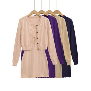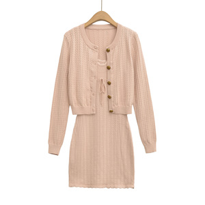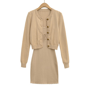 法式轻熟风气质两件套连衣裙早秋新款吊带短裙+圆领排扣开衫套装