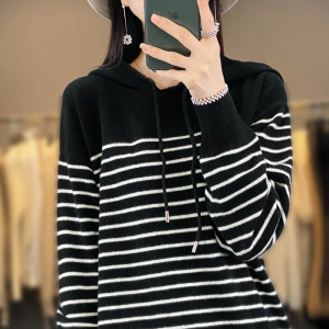 2025秋冬新款女衫休闲黑白条纹宽松针织连帽抽绳帽子衫毛上衣白色