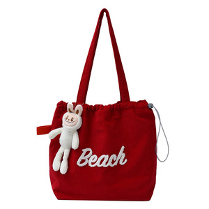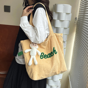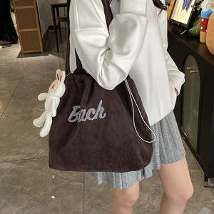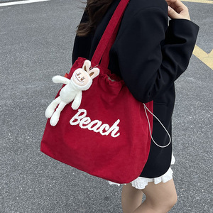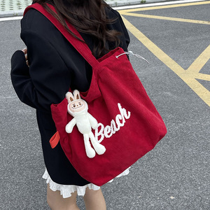 韩版红色条绒大容量托特包2025新款字母刺绣大学生上课帆布单肩包