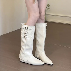 羊皮版~复古皮带扣两穿裤管靴内长筒靴女显瘦尖头气质骑士靴
