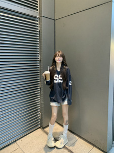 kumikumi美式辣妹复古印花V领长袖T恤女秋季宽松显瘦百搭减龄上衣
