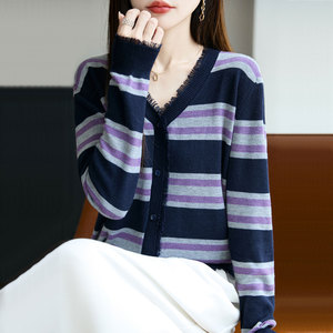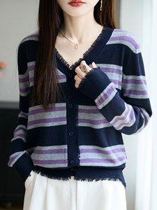【厂家直供】秋季薄款条纹外搭针织V领针织女士减龄开衫毛衣外搭
