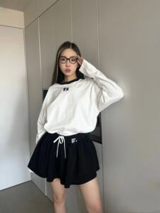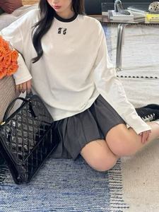现货高版本miu家字母黑白撞色领长袖t恤宽松百搭新款简约上衣女