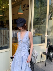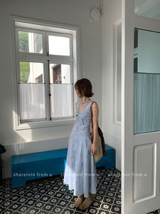shareinin 重工!!雾蓝岛屿 仿绣花镂空印花 蕾丝收腰连衣裙棉