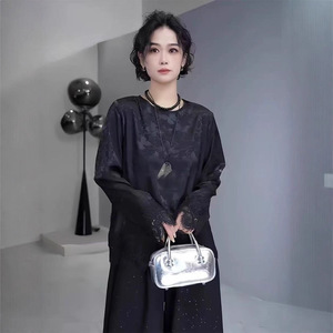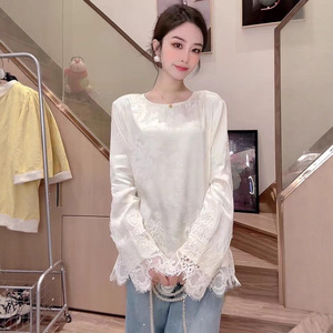 2025秋季新款国风蕾丝提花重工衬衣女宽松复古圆领长袖打底上衣潮