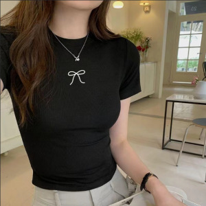 辣妹简约蝴蝶结高级感短袖新款美式休闲正肩显瘦T恤上衣服辣妹潮