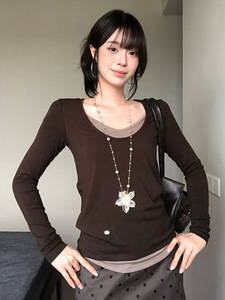 韩系慵懒假两件U领长袖T恤女秋季修身显瘦别致撞色拼接打底衫上衣