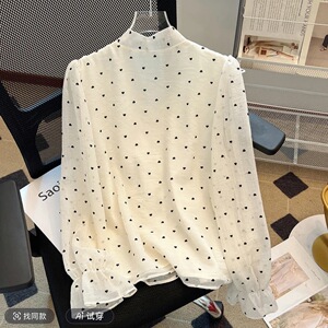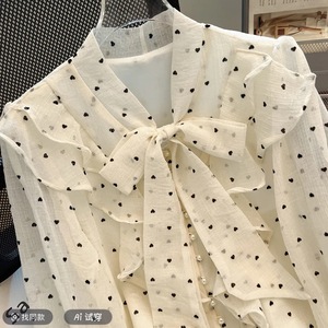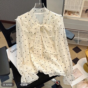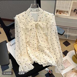 法式波点雪纺上衣女春蝴蝶结小衫气质名媛甜美荷叶边泡泡长袖衬衫