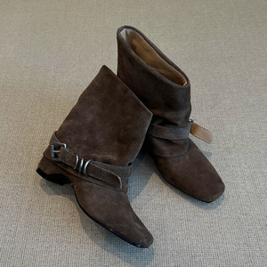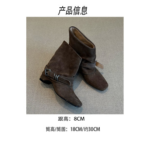 牛皮版~真皮复古方头绒面皮带扣中筒靴女坡跟宽筒靴西部靴马丁靴