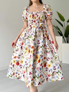 10838 跨境欧美亚马逊女士度假休闲泡泡袖花卉收腰A字连衣裙