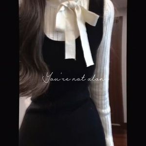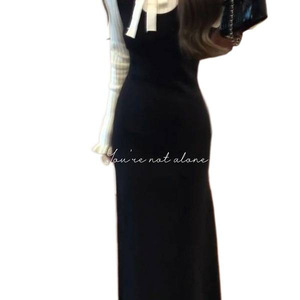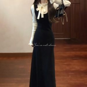 法式chic风蝴蝶结假两件拼接连衣裙女学生秋冬季气质收腰过膝长裙