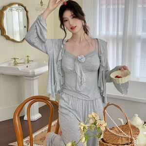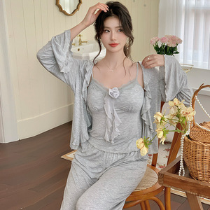 法式睡衣女胸垫女三件套春秋温柔浪漫开衫宽松套装家居服可外穿