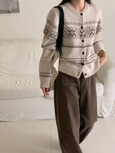 美式复古费尔岛提花圆领毛衣女2025秋冬韩系小众外搭短款针织开衫