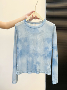 海底蓝渐变色扎染长袖网纱上衣防晒罩衫叠穿打底薄款T恤皮肤衣女