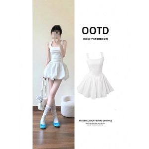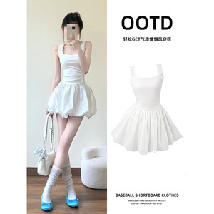 白色收腰吊带连衣裙女夏日漂亮绝美小白裙子蓬掐腰a字短款花苞裙