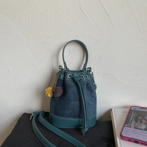 时尚麂皮绒水桶包韩系手提抽绳拼接洋气单肩包复古小众高级斜挎包
