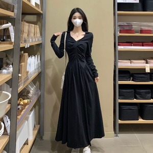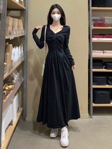 高级感赫本黑色V领长袖连衣裙秋季新款大码胖mm收腰显瘦垂感长裙