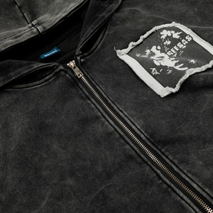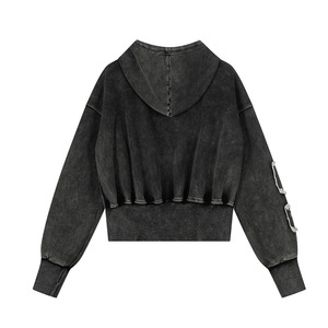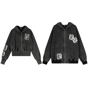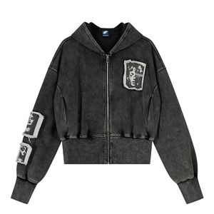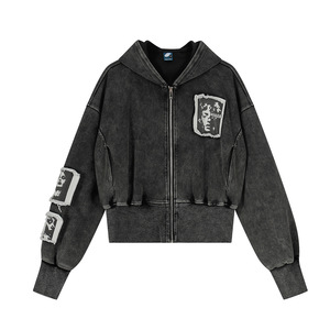 嘉衣库潮牌2025秋季新款美式复古帽衫短款外套水洗旧贴布拉链卫衣