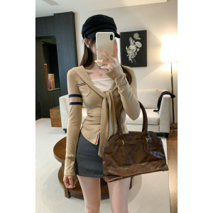 热销韩系披肩V领长袖T恤女2025早春新款修身显瘦独特设计感上衣