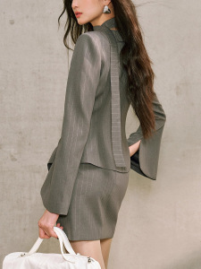 碎光感条纹亮丝 斜门襟长飘带收腰西装外套女高级感包臀短裙套装