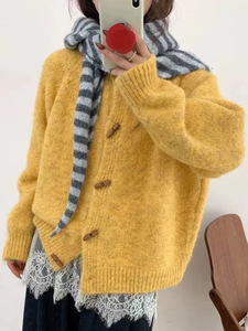韩系秋冬季宽松圆领牛角扣针织开衫温柔氛围感毛绒款针织衫外套女