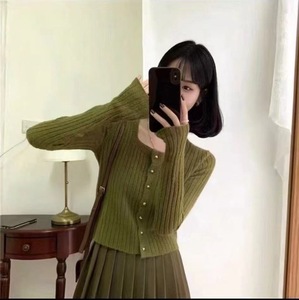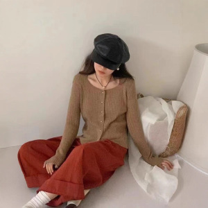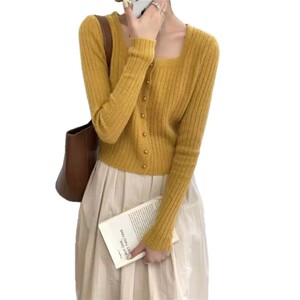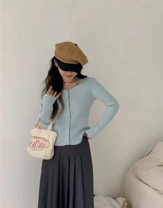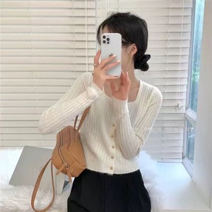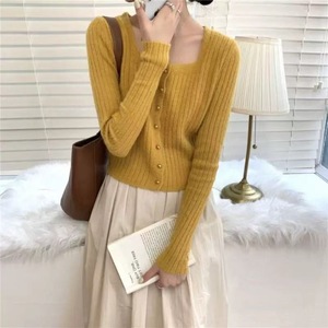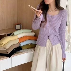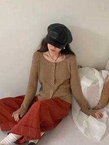 早秋新款法式方领珍珠圆扣坑条亲肤短款毛衣外套修身简约针织开衫