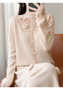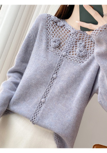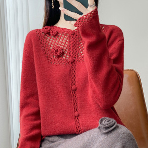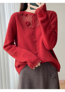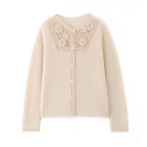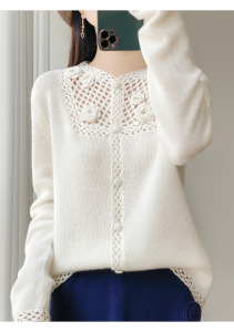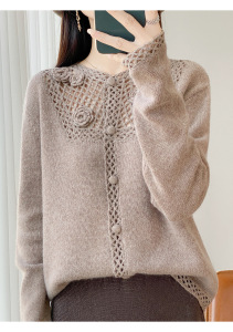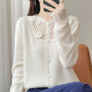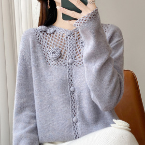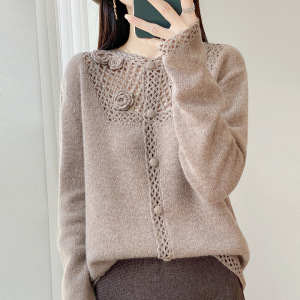 2025秋冬100%纯羊毛圆领女镂空手钩立体玫瑰编织软糯薄款开衫外套