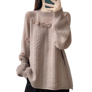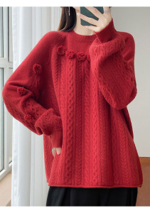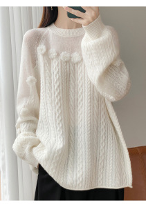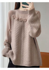 100羊毛重工立体花朵圆领羊绒衫女宽松慵懒风针织毛衣打底羊毛衫
