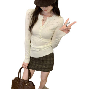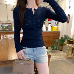 热销高级感半开领镂空长袖针织衫女2025早春新款修身显瘦上衣