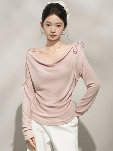 季优粉色荡领穿搭长袖打底衫女早秋一字领露肩内搭斜肩高级感上衣