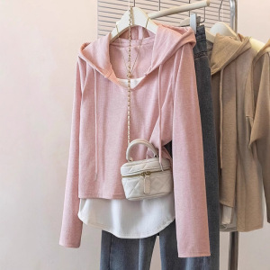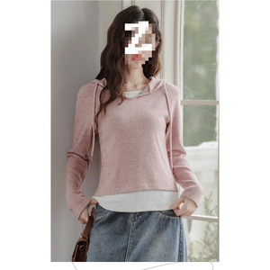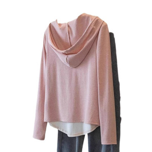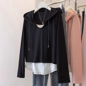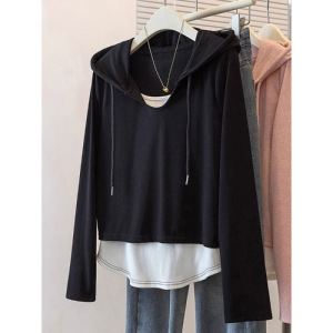 假两件连帽长袖T恤女大码秋季遮肚子显瘦休闲百搭打底衫上衣