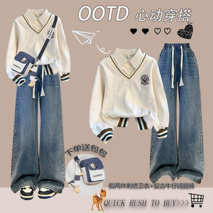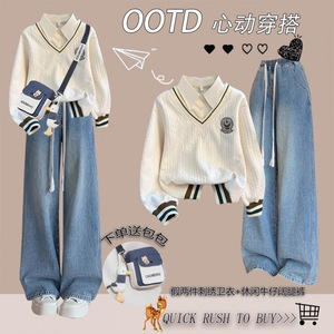 假两件米白卫衣+浅蓝牛仔裤送蓝包 828#