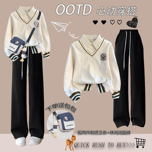 少女学生秋装套装2025新款初高中学生假两件卫衣洋气学院风两件套