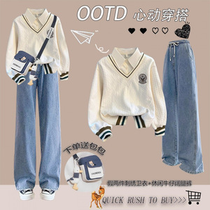 假两件米白卫衣+松紧牛仔送蓝包 828#