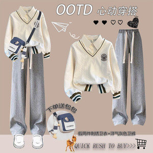假两件米白卫衣+灰休闲裤送蓝包 828#