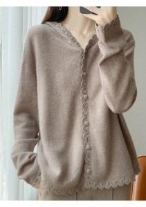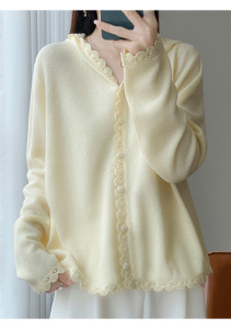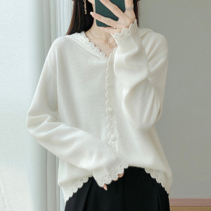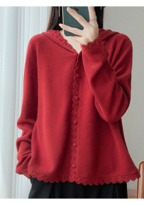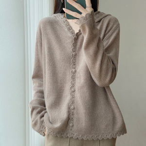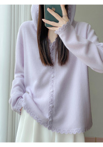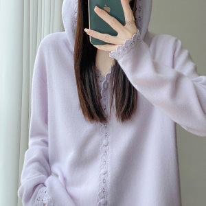 秋冬新款连帽100%纯羊毛针织开衫女宽松花边长袖羊绒帽衫纯色外套