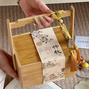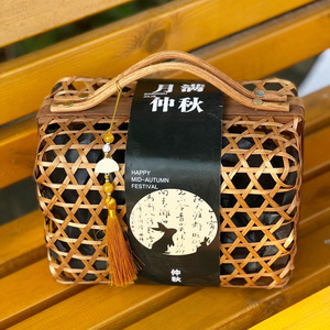 大竹木提篮空盒+仲秋封条+2随机中秋卡片+金钱结流苏+兔耳流苏 约24.5*19.5*11.5cm
