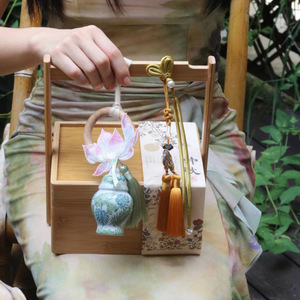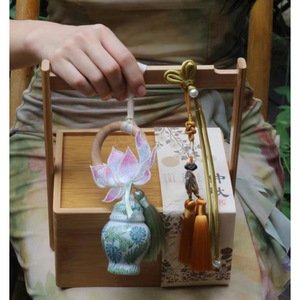 小竹木提篮空盒+仲秋封条+金钱结流苏+兔耳流苏+『绿意釉陶』莲花挂件 约19.5*15*11.5cm