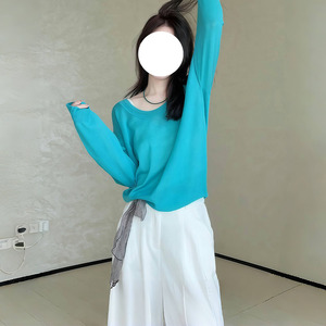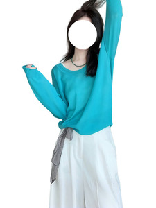 蓝色宽松短款针织罩衫长袖t恤女2025新款春季流行穿搭多巴胺上衣