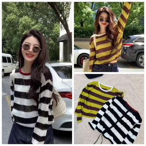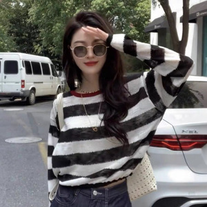 撞色条纹圆领长袖女式针织衫2025新款早秋宽松休闲防晒罩衫上衣潮