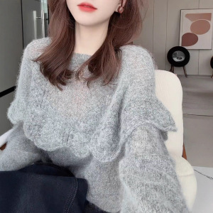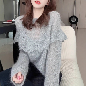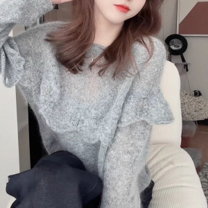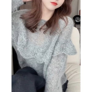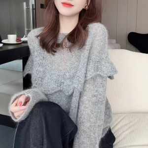 韩版2025早秋穿搭钩花镂空荷叶边灰色舒适软糯宽松百搭圆领上衣