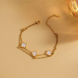欧美新款女士幸运四叶草不锈钢金手链韩版简约双层运珠圆珠手饰