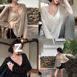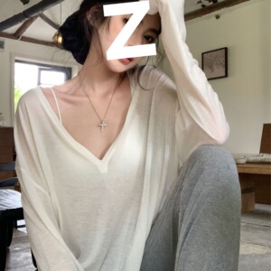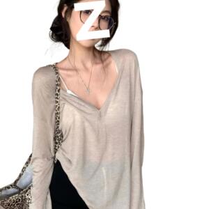 休闲慵懒宽松爵士防晒罩衫美式长袖v领上衣松弛感薄款微透T恤女夏