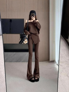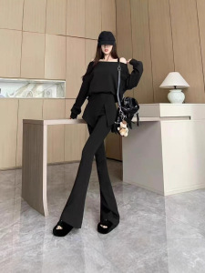 法式时尚休闲套装女秋季新款宽简约松慵懒一直肩+修身显瘦微喇裤