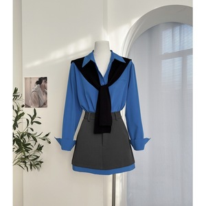 实拍mina家草原娜日太泡菜衬衫+披肩+灰色蓝边西装半裙套装