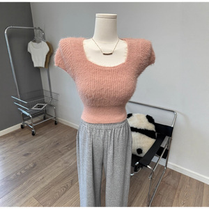现货 东大门方领短袖毛毛针织衫修身短款打底衫上衣
